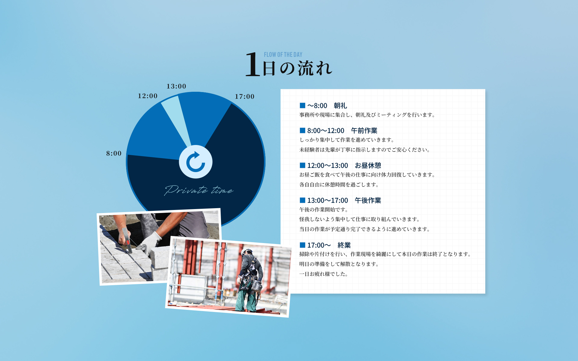 工事内容によっては危険な仕事もございます。私達はホウ・レン・ソウを徹底し、お互いに意思疎通を図り仕事に取り組みます。