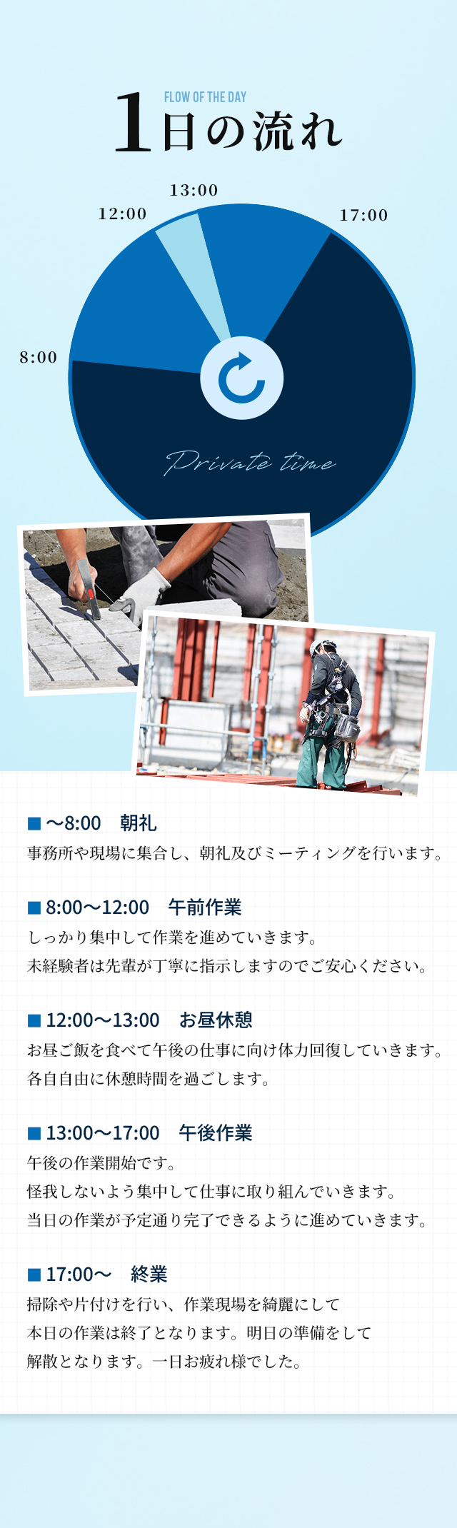 少しでも基礎工事、外構工事、解体工事、土木工事等に関わる現場仕事をしてみたいという気持ちがあれば会社全体で、一人前の技術者として独り立ちできるように教育していきます。