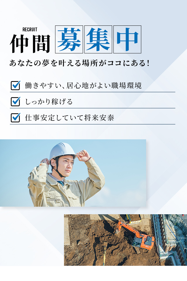妥協せず仕事に打ち込める基礎工事、外構工事、解体工事、土木工事等の現場作業員大歓迎です!